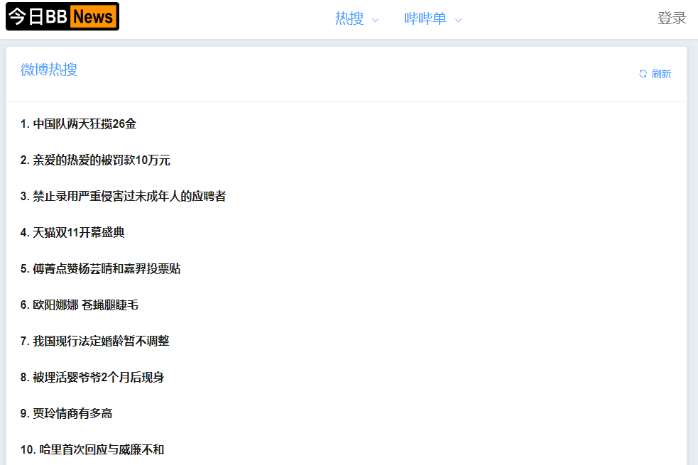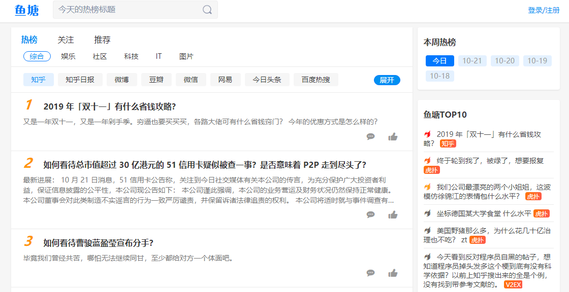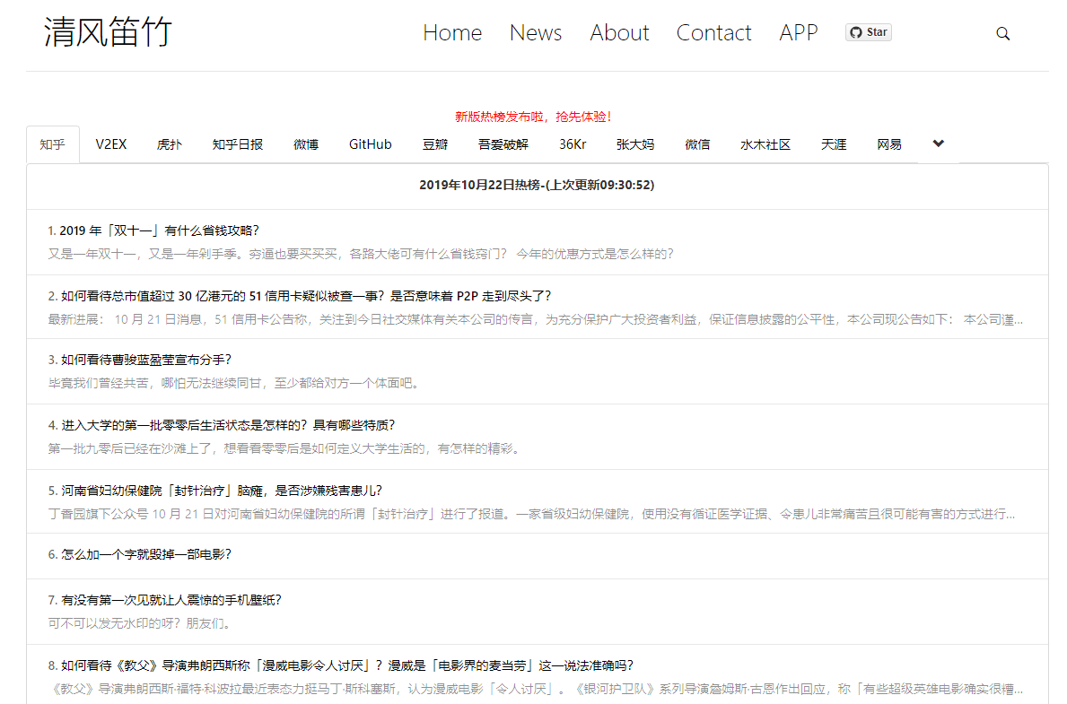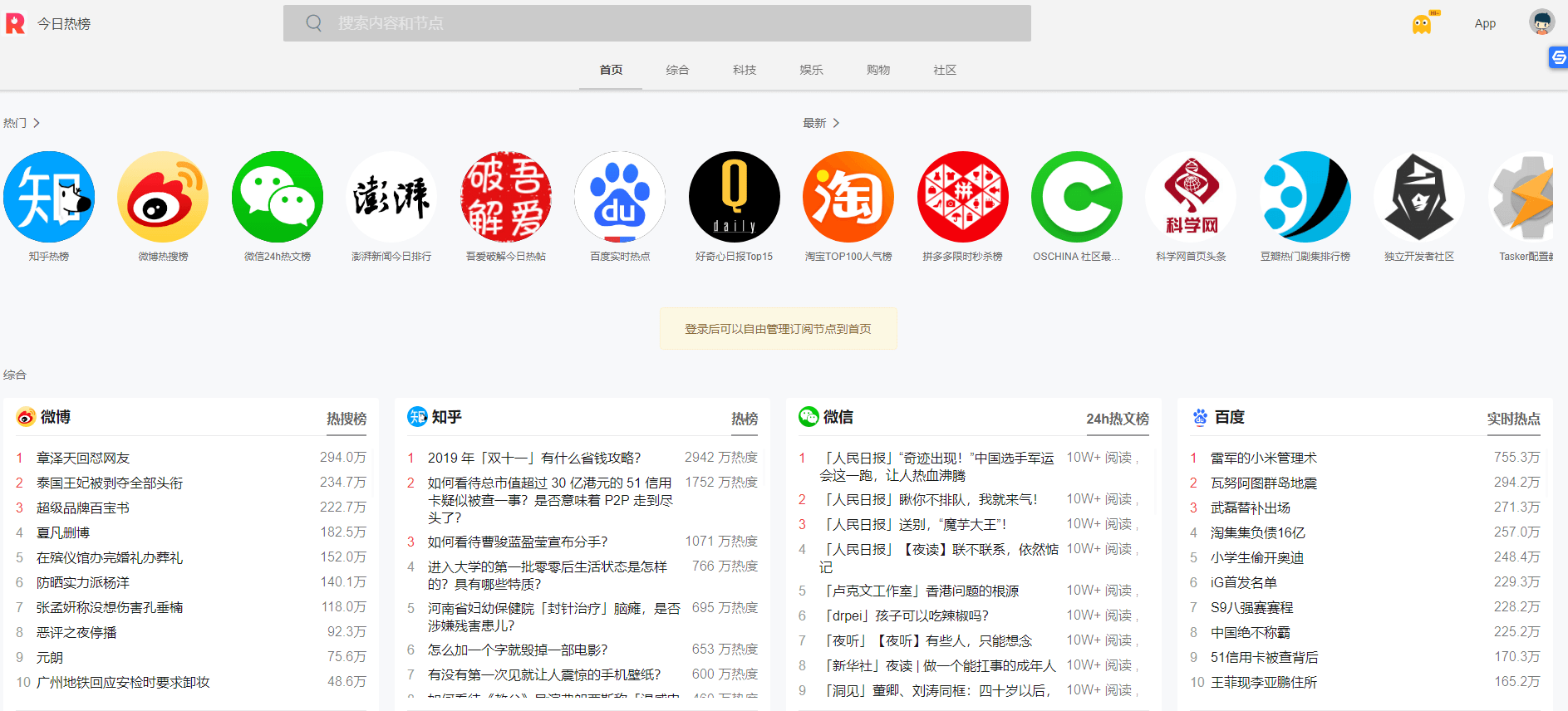 热点分类:热榜聚合,热门新闻,今日头条,热搜,热词,新闻聚合,摸鱼,今日头条,头条,百度,知乎,V2EX,微博,贴吧,哔哩哔哩,AcFun,网易新闻,公众号,煎蛋,果壳,hostloc,solidot,新浪科技,豆瓣,天涯,虎扑,华尔街,知乎,微信