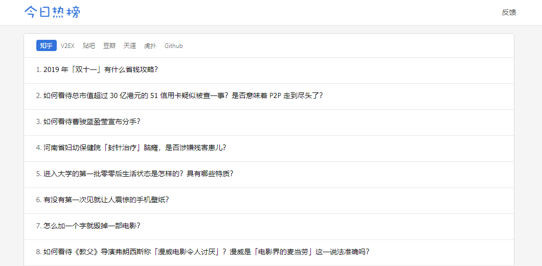 热点分类:知乎、V2EX、微博、贴吧、豆瓣、天涯、虎扑、Github、华尔街见闻