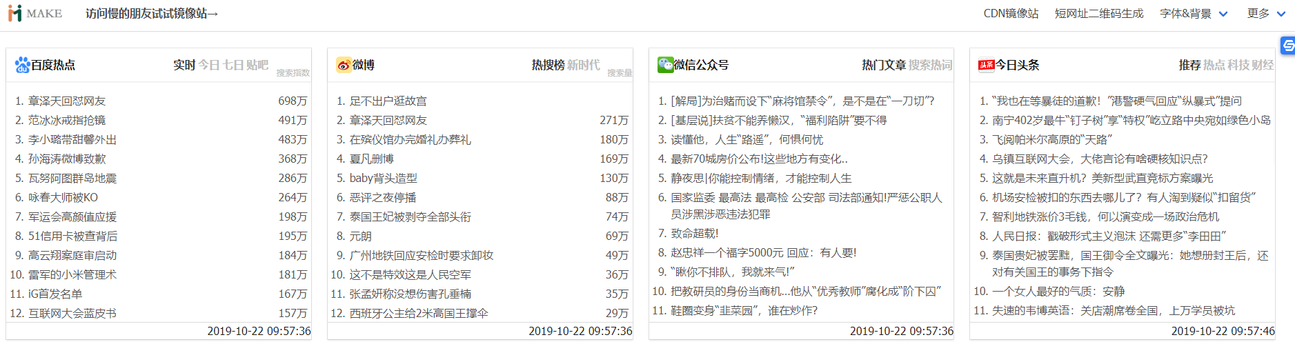将各大的资讯阅读平台中的新闻头条汇聚一起,第一时间查看到最新最热的新闻资讯,类似今日热榜的一些网站,发现有个大佬收集的更全面,整合了一下之前分享的今日热榜网站。